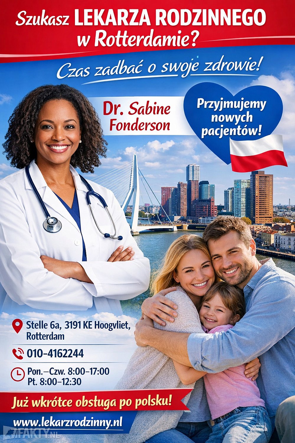 Dla Polaków z Rotterdamu i okolic to może być bardzo ważna informacja — praktyka dr Sabine Fonderson w Hoogvliet jest otwarta dla nowych pacjentów. Adres i telefon podane oficjalnie przez praktykę to Stelle 6a, 3191 KE Hoogvliet oraz 010-4162244.